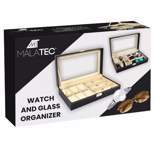 Förvara dina accessoarer säkert och stilrent med denna eleganta klock- och glasögonorganizer från MALATEC. Perfekt för både vardagsbruk och som en exklusiv present.