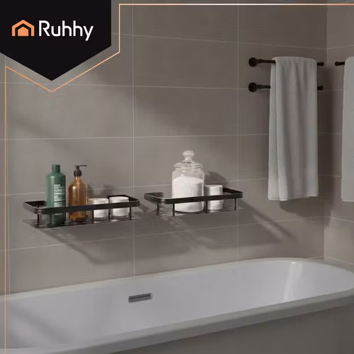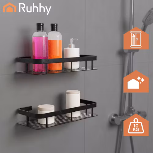 Sorte brusehylder i aluminium - sæt med 2. Nem montering uden at bore. Perfekt til badeværelser og køkkener. Stilfuldt og rustfri design.