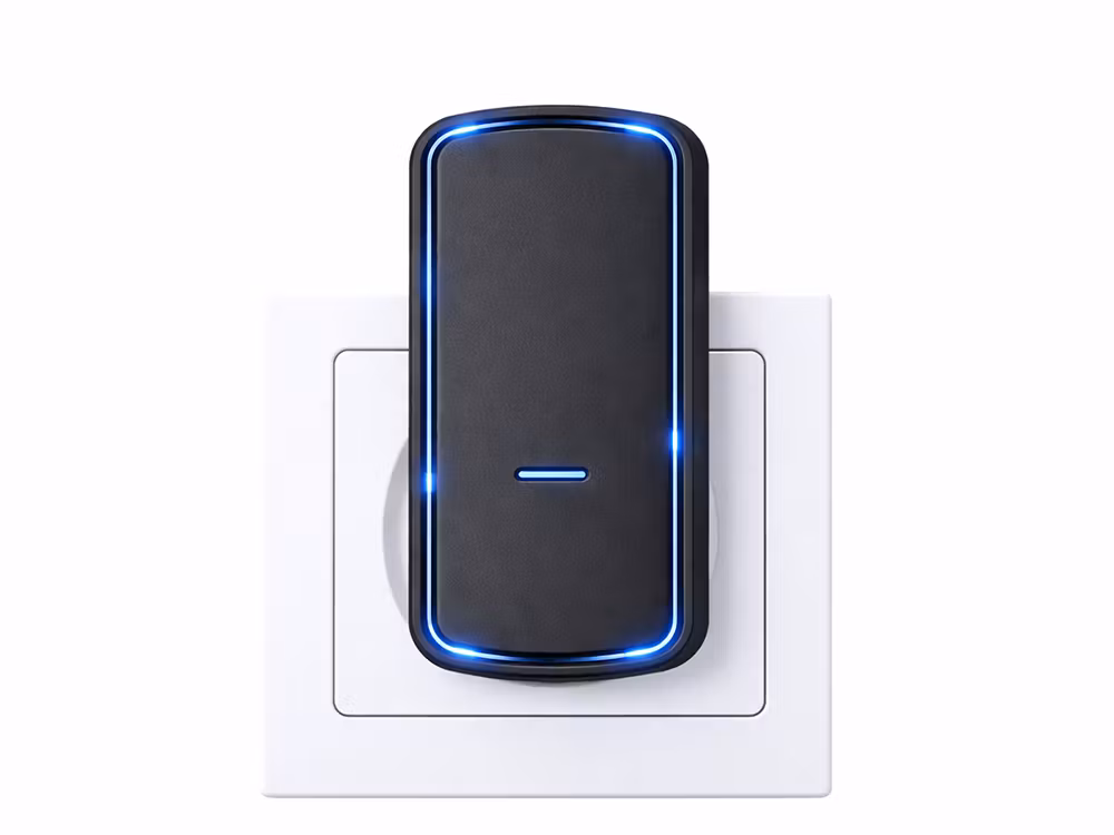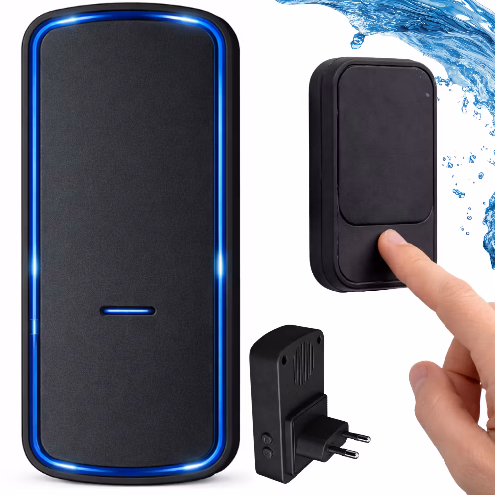 Moderne trådløs dørklokke uden batteri. 130 m rækkevidde, 38 melodier, LED-signal og IP68 vandtæt design. Nem installation.