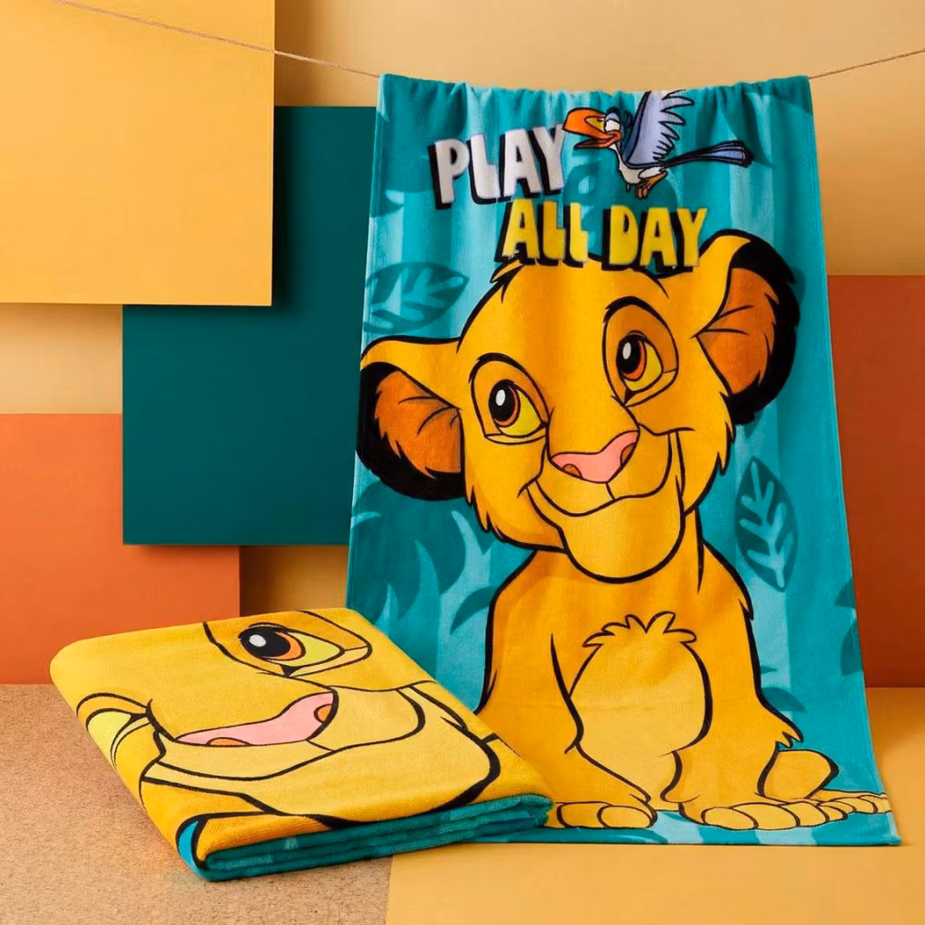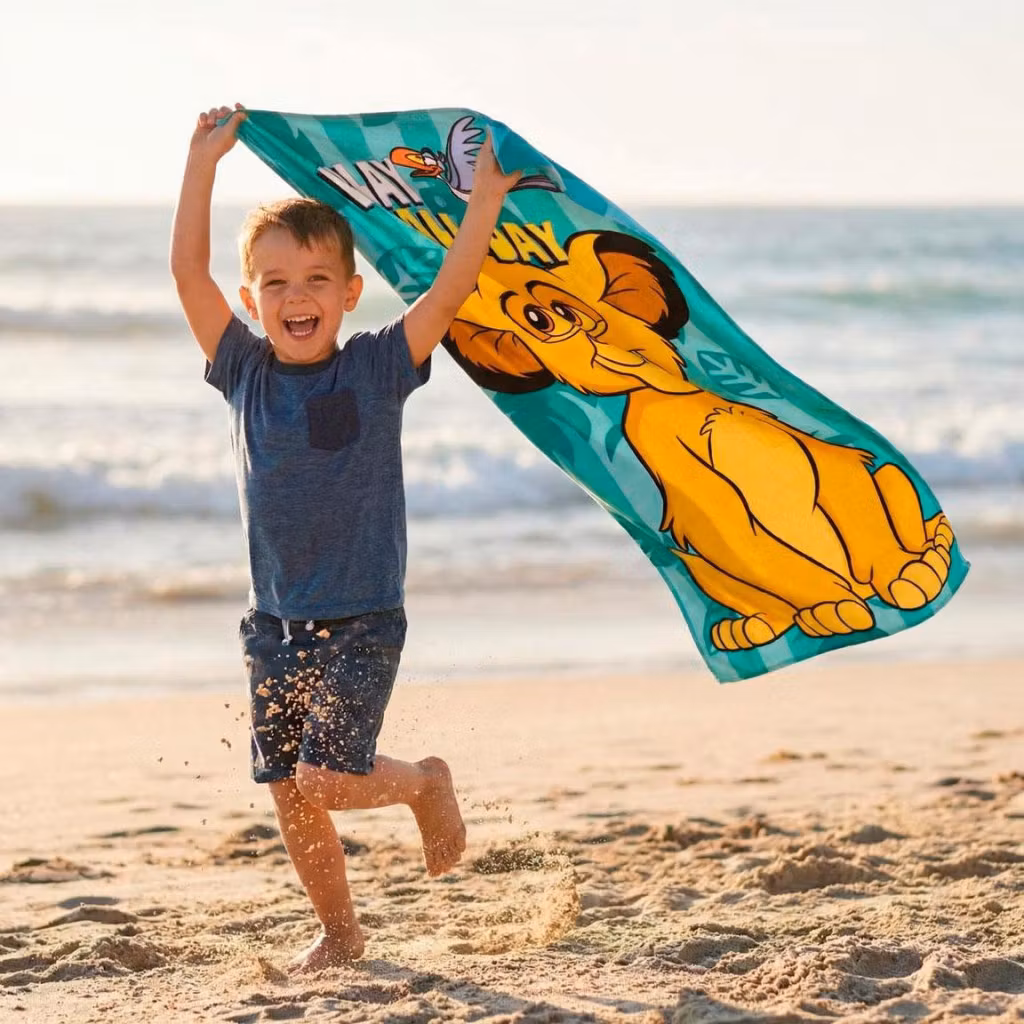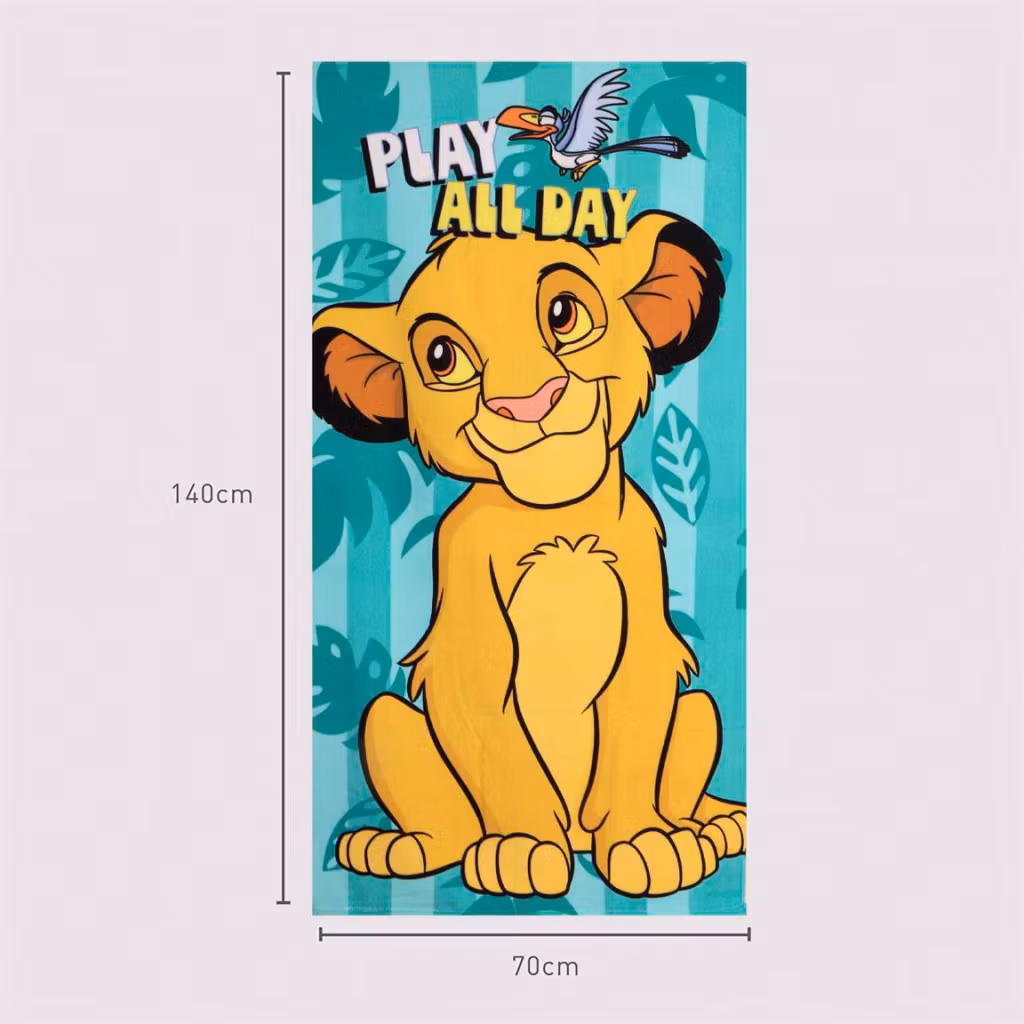 Njut av soliga dagar med denna fina strandhandduk med motiv från Lejonkungen. Perfekt för både barn och vuxna – ett färgstarkt och praktiskt val för strand, pool eller semester.