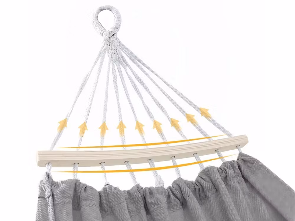 Den är tillverkad av slitstarkt material, liksom de tjockt vävda snörena. Allt detta gör hängmattan hållbar och luftgenomsläpplig, vilket gör att det blir mycket behagligt att använda den.