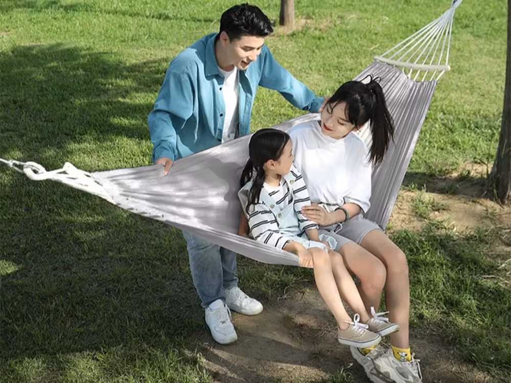 Hängmattan kan hängas var som helst. Knyt bara fast de två ändarna på en stabil yta, såsom stolpar, krokar eller träd.
