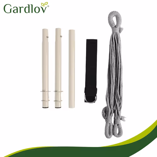 Den omslutande sitsen i tjock och slitstark bomullsblandning ger hög komfort, medan den stabila metallstången håller stolen utspänd för en trygg och avslappnad sittupplevelse. De två medföljande kuddarna gör att du kan luta dig tillbaka och njuta direkt – perfekt för att läsa, vila eller bara koppla av.