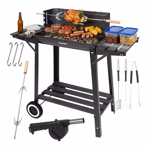 kolgrill, grill med lock, rotisserie grill, trädgårdsgrill, KAMINER grill, grill med sidobord