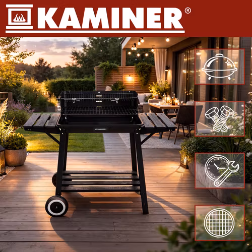 Upptäck en stabil och mångsidig kolgrill från KAMINER, perfekt för sommarens grillkvällar. Denna grill är utrustad med både rotisserie (spett) och ett extra övre galler, vilket gör det enkelt att tillaga flera rätter samtidigt och hålla maten varm.