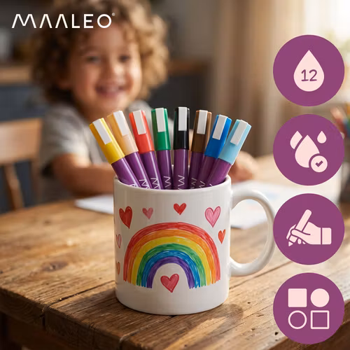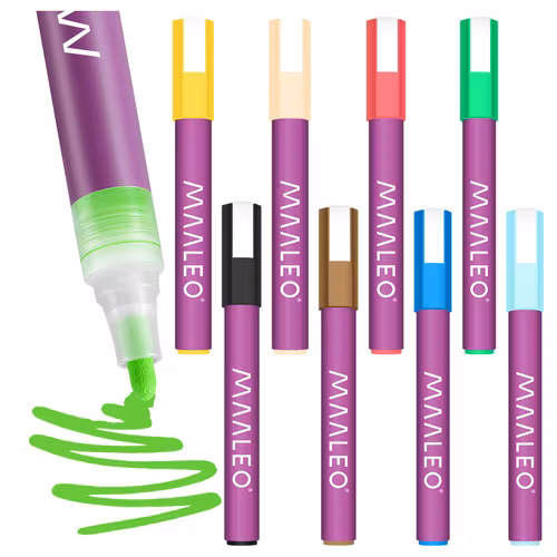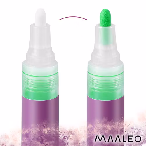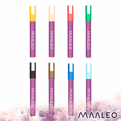 • MAALEO akrylpennor är pennor med riktig akrylfärg, inte pennor med vattenbaserat pigmentbläck. Det betyder att de har andra egenskaper än klassiska fineliners eller tuschpennor - De är utformade för att måla, dekorera och fixera mönster, inte för typisk skrivning på tunt papper. Tack vare sin akrylformula ger de intensiv täckning och hållbarhet på många olika ytor utan att tränga igenom.