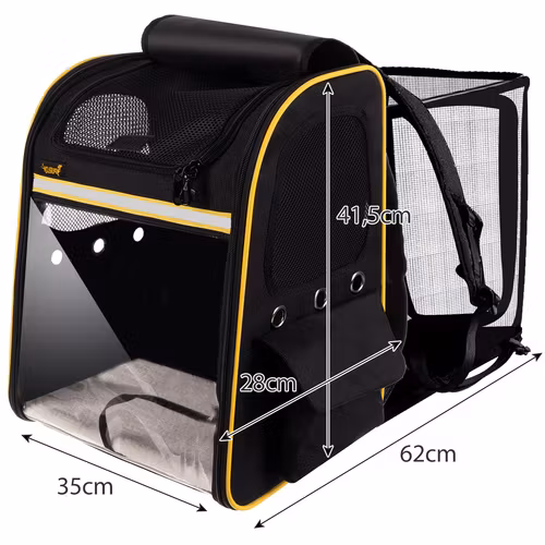 FÖRSTÄRKT - väskan är tillverkad av starkt material, som är ganska mjukt och stabilt på sidorna, och har ytterligare förstyvning på botten och mjuk insats på toppen. Ryggsäckens framsida är en transparent tjock folie. Husdjuret kan därför observera vad som händer utanför och känner inget obehag under transporten.