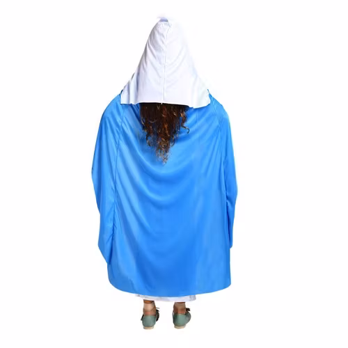 MARIAS KLÄD - består av en lång vit klänning med en blå kappa påsydd. Materialet den är tillverkad av är av hög kvalitet, mjukt och lätt. Det begränsar inte rörelsefriheten under lek. Klänningen är lös och ger rörelsefrihet. Den designades för att återspegla Marias ödmjuka och dygdiga natur med grace och blygsamhet. Ett blått skärp att knyta i midjan är fäst vid klänningen.