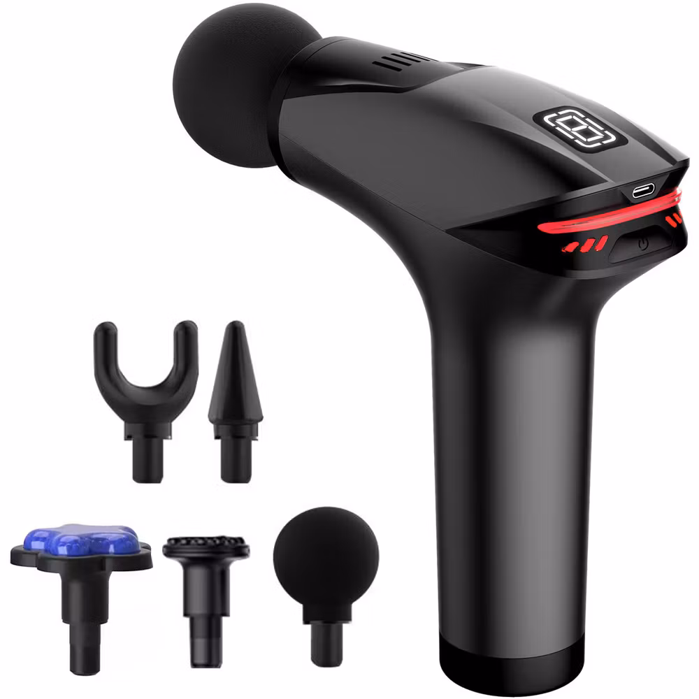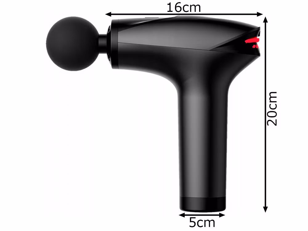 - Massageapparaten har utformats i en ergonomisk pistolform så att den passar perfekt i handen. Den innehåller 5 olika spetsar, var och en utformad för en annan muskeldel.