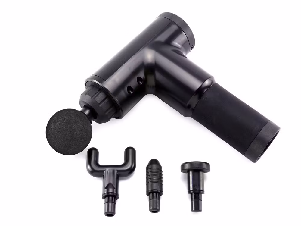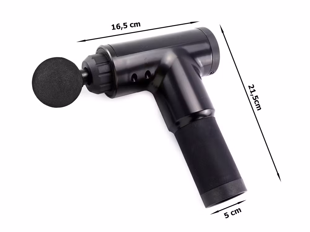 - Massageapparaten har utformats i en ergonomisk pistolform så att den passar perfekt i handen. Den innehåller 4 olika spetsar, var och en utformad för en annan muskeldel.