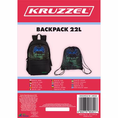 •SKOVÄSKA OCH IDROTTSKLEDNING – i setet ingår även en praktisk väska för ombyte av skor eller idrottskläder, tillverkad av högkvalitativ polyesterfiber. Detta material är motståndskraftigt mot nötning och skador och lätt att hålla rent. Väskan har dubbla, starka snören som enkelt kan dras åt upptill, vilket säkerställer snabb och bekväm stängning. Tack vare den speciella konstruktionen kan väskan även bäras som ryggsäck, vilket är en praktisk lösning till exempel på väg till sportaktiviteter. Detta är ett mångsidigt tillbehör som perfekt kompletterar hela setets funktionalitet. På ena sidan har väskan en stor gamer-grafik, samma som på ryggsäcken, väskans baksida är svart.