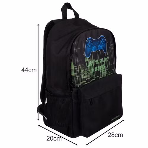 •GENOMTÄNKSAMT INTERIÖRFÖRDELNING - ryggsäcken har ett rymligt huvudfack, stängt med en dragkedja med två skjutreglage, vilket möjliggör bekväm öppning och stängning. Inuti finns en stor, förstyvad ficka, perfekt för att bära en bärbar dator, ritblock eller konstverk, vilket ger dem tillräckligt skydd mot skador. På framsidan av ryggsäcken finns också en mindre ficka med dold dragkedja, perfekt för att packa frukost eller förvara småsaker som nycklar, telefon eller plånbok. Modern spelgrafik är placerad ovanför fickan i intensiva färger, vilket ger ryggsäcken en unik karaktär och kommer säkerligen att tilltala användare som är fascinerade av spelens värld.