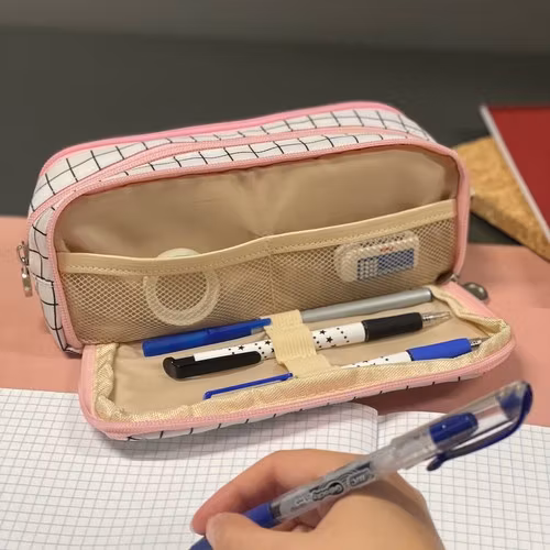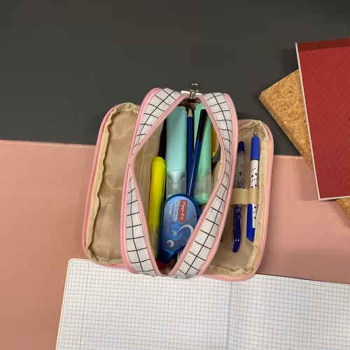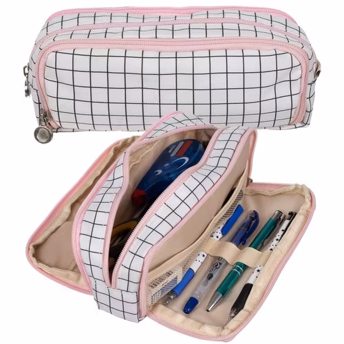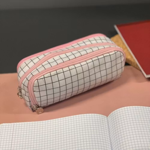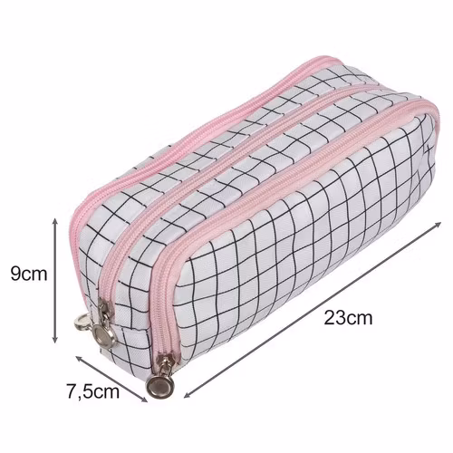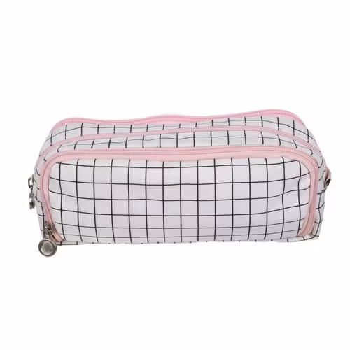•I DESIGNERSTIL - detta trefackspennfodral utmärker sig för sitt eleganta utseende och moderna design. Pennfodralet är tillverkat av slitstarkt material och garanterar inte bara långvarig användning, utan också ett estetiskt utseende. Det kommer perfekt att återspegla användarens personlighet och stil. Dess eleganta utseende, svarta rutmönster och rosa dragkedjor gör att det även fungerar bra som sminkväska.