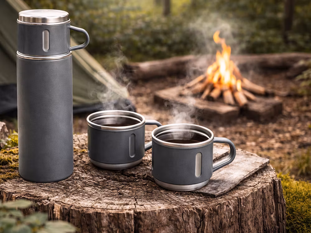 ☕ Termos 400 ml med 3 muggar – rostfritt stål för resa & friluftsliv